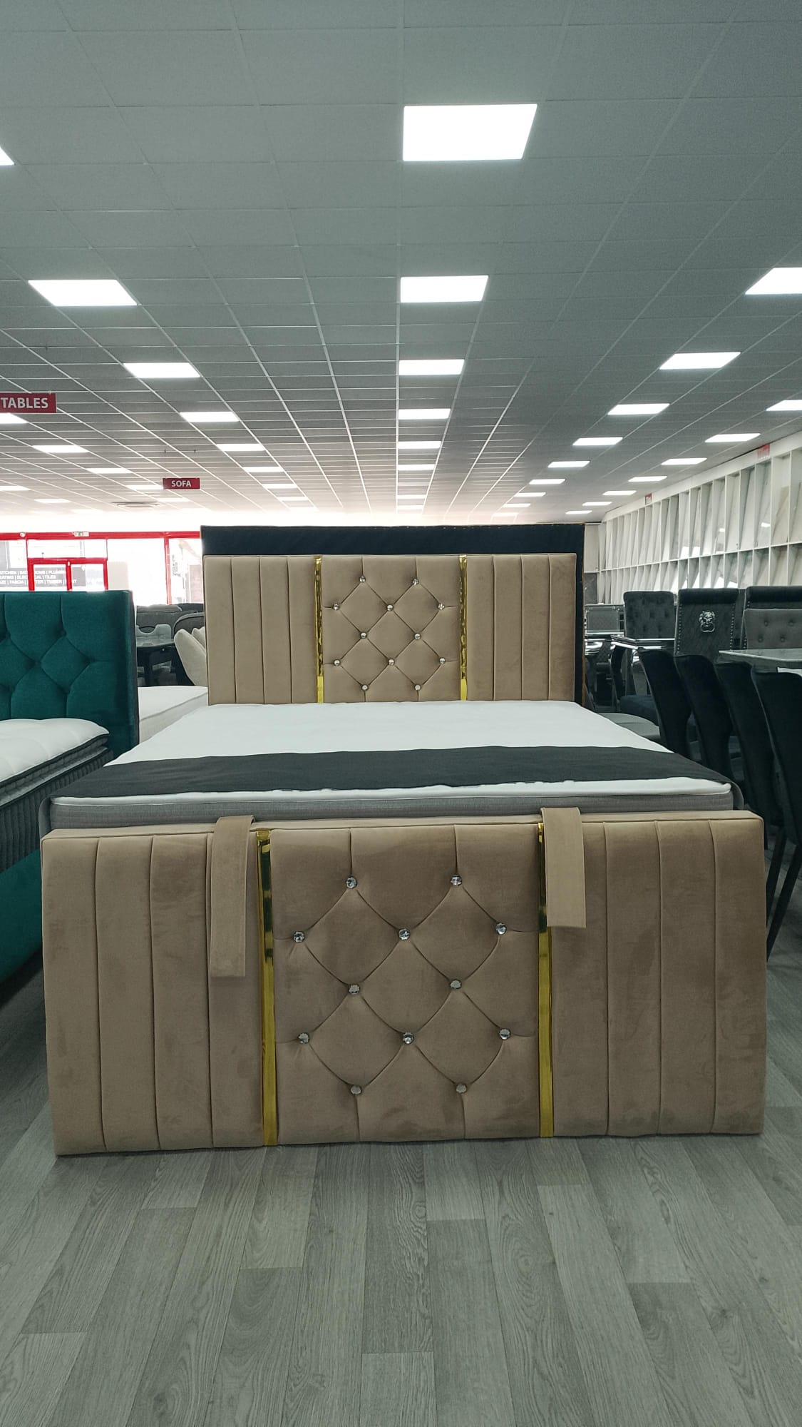 Elevate your bedroom with this elegant sleigh bed frame, designed to combine timeless style with modern luxury. Upholstered in a soft, velvet-like fabric, the bed features a beautifully curved headboard and footboard with deep button tufting and crystal-style accents that add a touch of glamour. Vertical panel detailing and subtle gold-tone trims enhance its sophisticated look, making it a true statement piece.