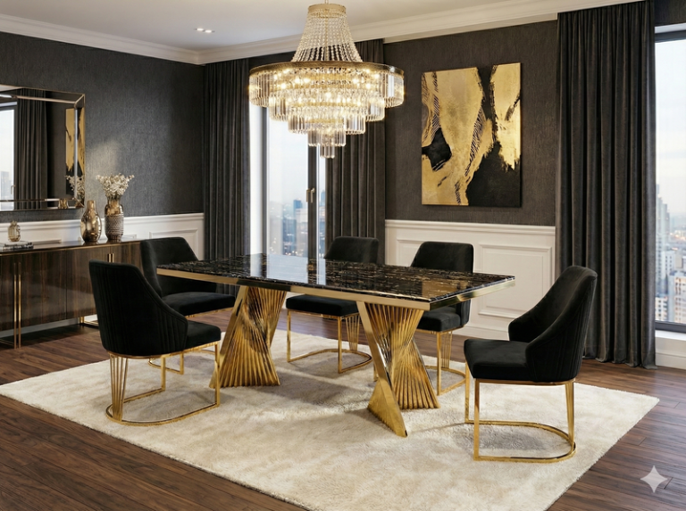 With its generous 180cm length, the table provides ample space for family meals and entertaining guests, comfortably seating up to 6 people. Its strong and sculptural gold base ensures excellent stability while enhancing the overall luxury design.